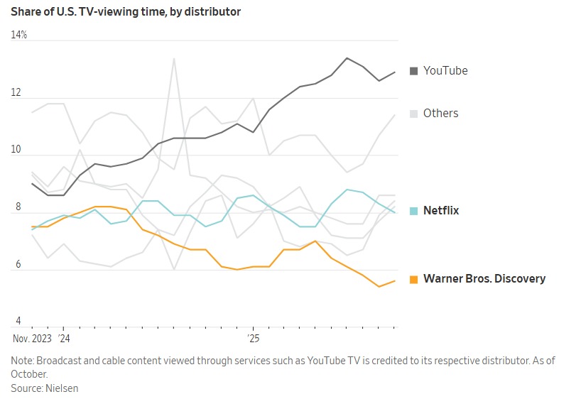 Η Netflix, που αρχικά «έκλεψε» κοινό από την παραδοσιακή τηλεόραση και την καλωδιακή, χάνει πλέον μερίδιο χρόνου θέασης στις ΗΠΑ προς όφελος του YouTube. Η πλατφόρμα της Google φιλοξενεί μια τεράστια και συνεχώς αυξανόμενη γκάμα περιεχομένου, από βίντεο δημιουργών και podcasts μέχρι αθλητικά clips.