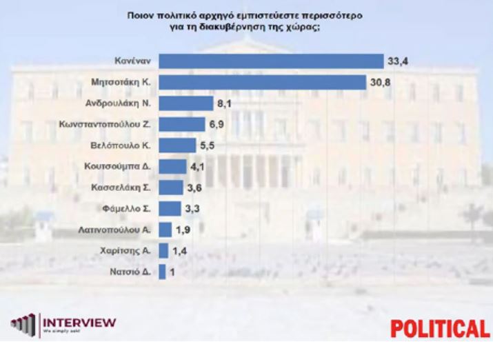 Στο ερώτημα ποιον θεωρείται καταλληλότερο για την διακυβέρνηση της χώρας ο «Κανένας» λαμβάνει 33,4% και ακολουθεί ο Κυριάκος Μητσοτάκης με 30,8%.