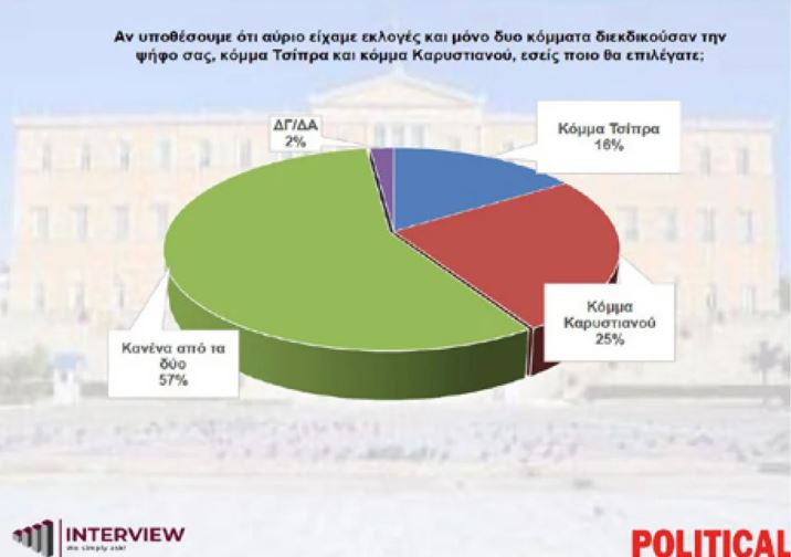 Εντυπωσιακό είναι το γεγονός ότι ο Αλέξης Τσίπρας, παρά την επικοινωνιακή καταιγίδα που ακολούθησε την έκδοση και την παρουσίαση του βιβλίου του, δεν δείχνει να συγκινεί την κοινή γνώμη. Μάλιστα στο υποθετικό ερώτημα «αν αύριο είχαμε εκλογές και μόνον δύο πολιτικά κόμματα διεκδικούσαν την ψήφο σας, κόμμα Τσίπρα και κόμμα Καρυστιανού, εσείς ποιο θα επιλέγατε;», το 57% απαντά κανένα από τα δύο, το 25% κόμμα Καρυστιανού και το 16% κόμμα Τσίπρα.