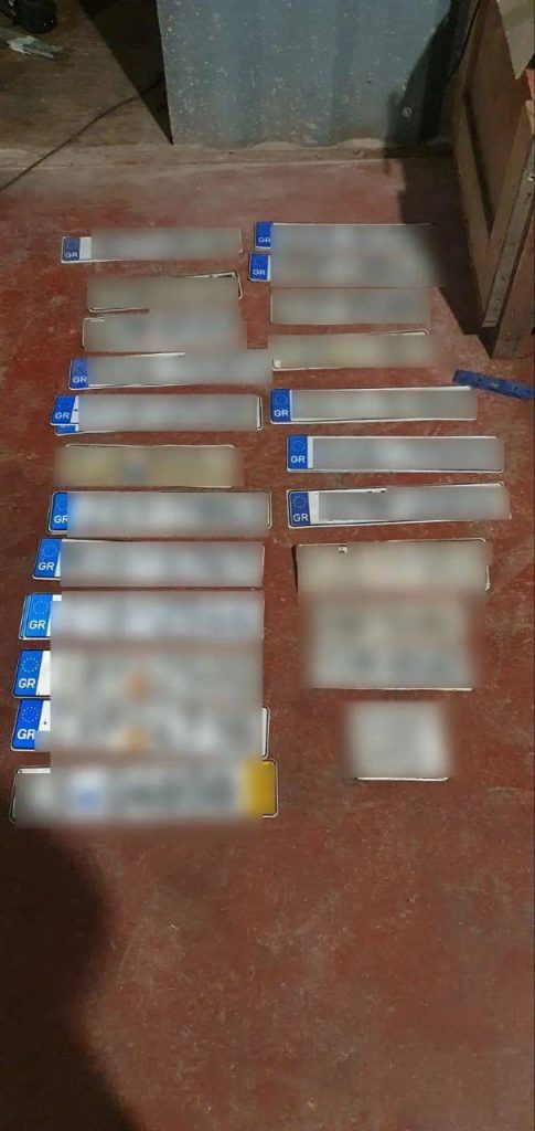 - πλήθος πινακίδων κυκλοφορίας αυτοκινήτων, αμφιβόλου γνησιότητας,