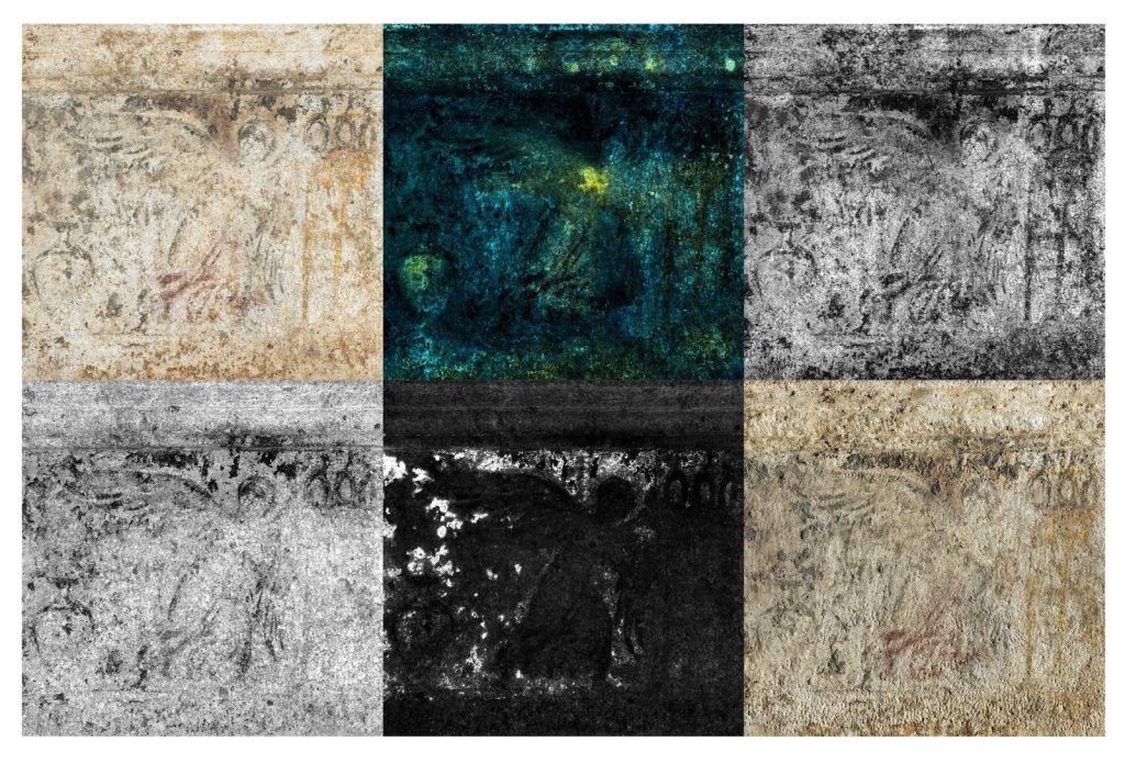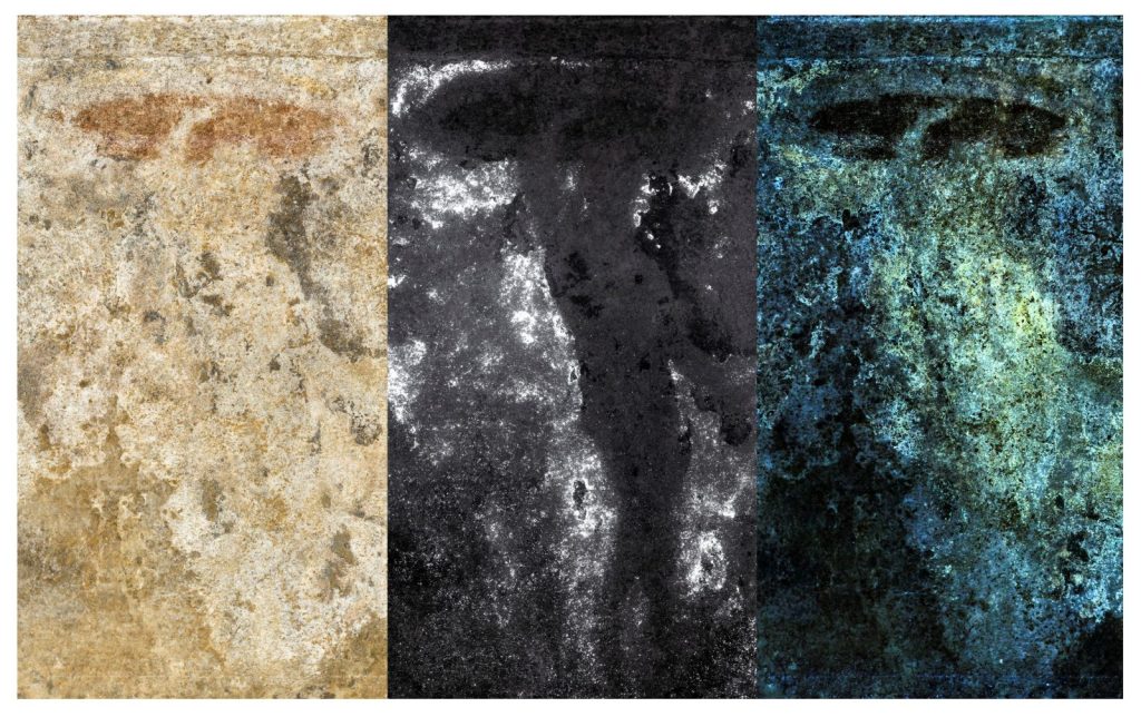 Κεφάλι ανατολικής Σφίγγας φωτογραφημένο με διαφορετικές τεχνικές α) στο ορατό φάσμα, β) στο υπεριώδες φάσμα, γ) φθορισμός υπό υπεριώδη ακτινοβολία.
