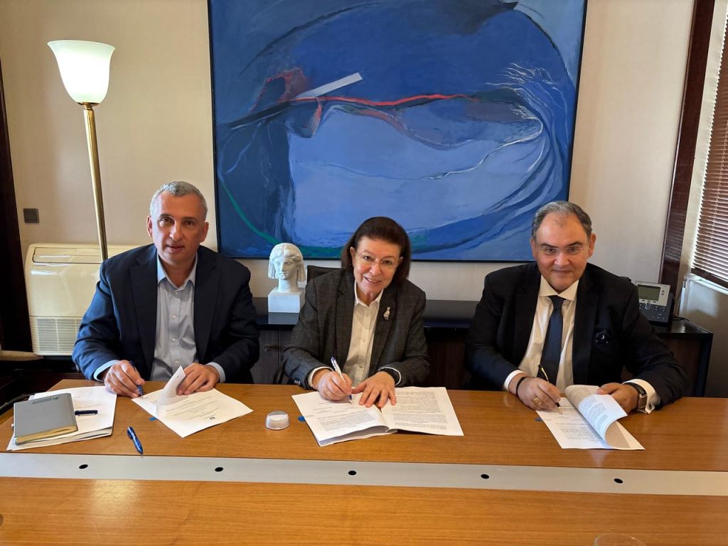 Η Λίνα Μενδώνη, με τον Πρόεδρο του Εθνικού Ιδρύματος Ερευνών Δημοσθένη Σαρηγιάννη και τον Πρόεδρο του ΔΣ και Διευθυντή Εθνικού Κέντρου Έρευνας Φυσικών Επιστημών «Δημόκριτος», Ευάγγελο Καρκαλέτση.