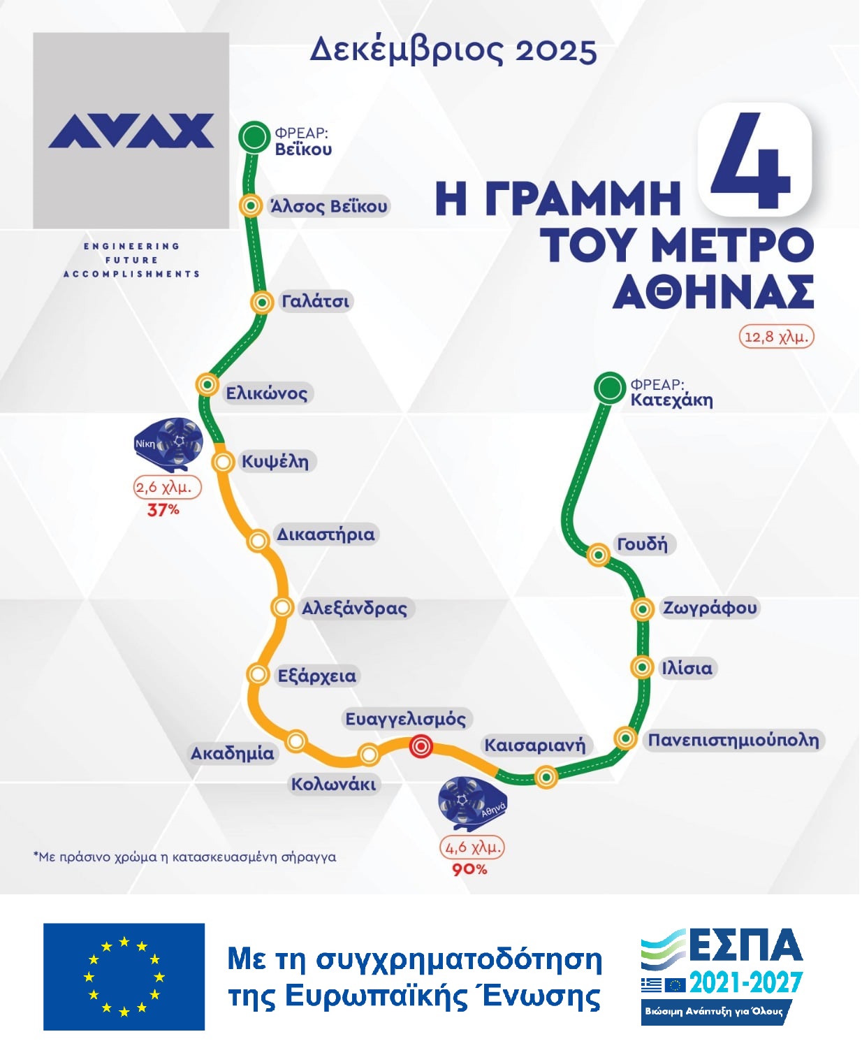 Η «Αθηνά», που ξεκίνησε από το φρέαρ Κατεχάκη, κινείται στην τελική ευθεία για τον προορισμό της και η κεφαλή του υπερσύγχρονου μετροπόντικα, σε ένα ορόσημο της αποστολής του, αναμένεται να «αποκαλυφθεί» σύντομα στο φρέαρ Ευαγγελισμού. Εν συνεχεία ο μήκους 100 μέτρων μετροπόντικας θα αποσυναρμολογηθεί. Σημειώνεται ότι η «Αθηνά», για να φτάσει λίγο πριν τον Ευαγγελισμό, έχει περάσει τους σταθμούς Γουδή, Ζωγράφου, Ιλίσια, Πανεπιστημιούπολη και Καισαριανή.