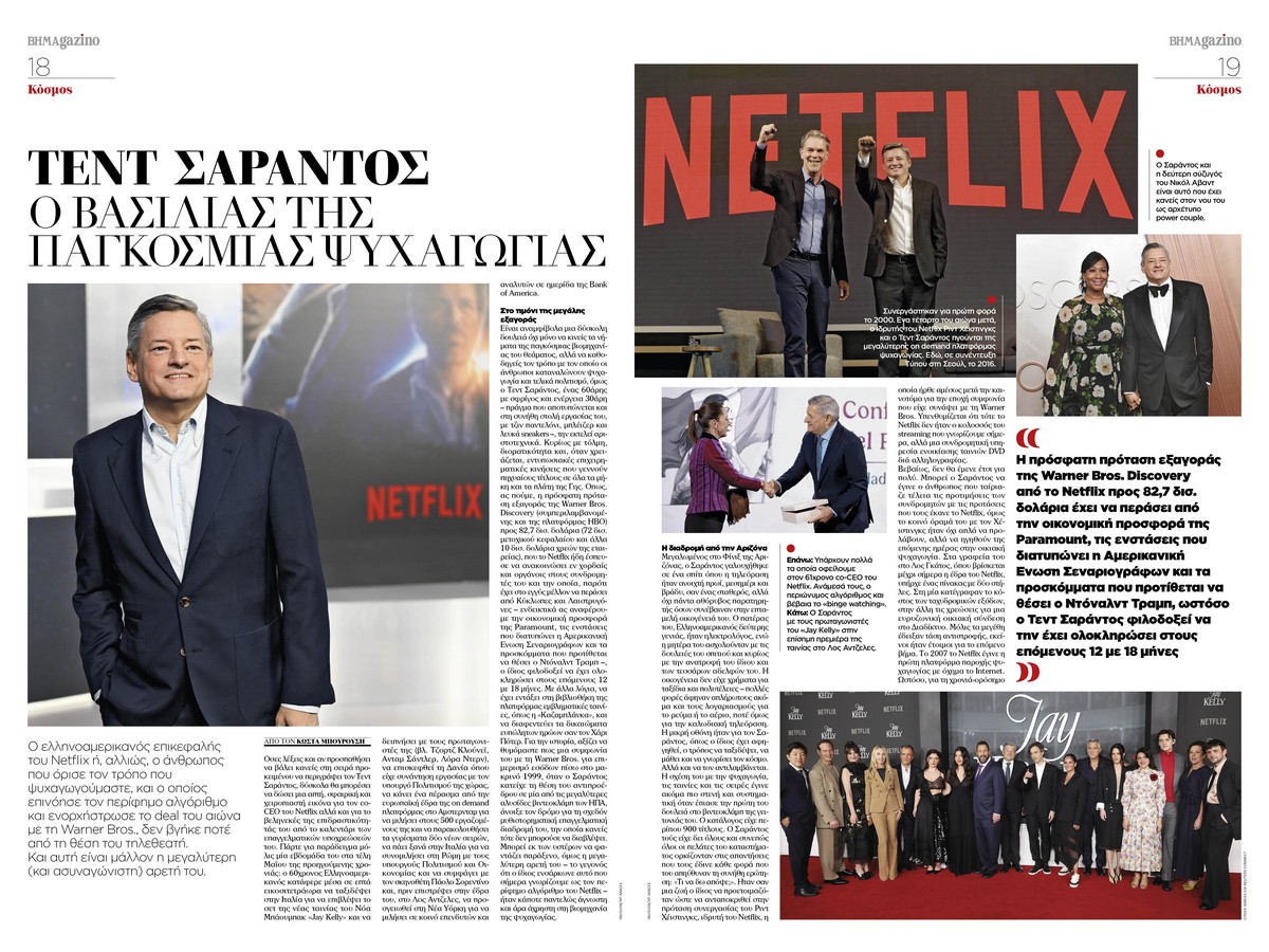 Τέλος, ξεχωρίζει το πορτρέτο του Τεντ Σαράντος, του ελληνοαμερικανού επικεφαλής του Netflix, του ανθρώπου που άλλαξε τον τρόπο που ψυχαγωγούμαστε, επινόησε τον περίφημο αλγόριθμο και ενορχήστρωσε το deal του αιώνα με τη Warner Bros, χωρίς ποτέ να χάσει τη ματιά του απλού τηλεθεατή.
