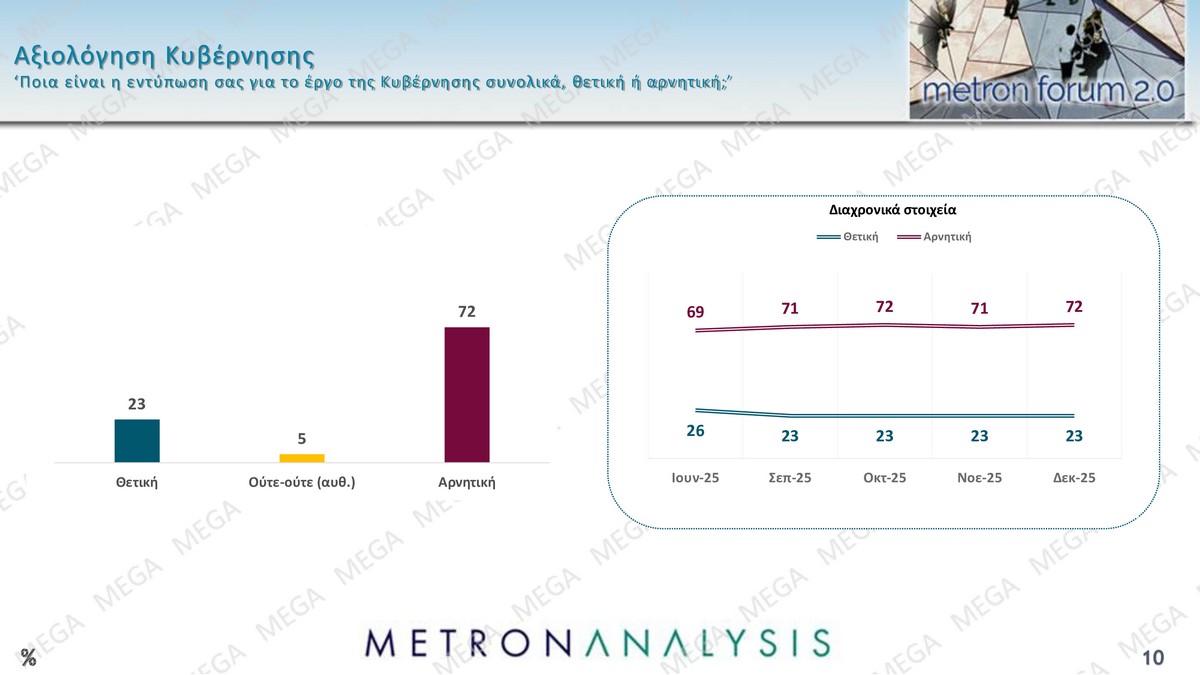 Το 72% κρίνει αρνητικά το έργο της Κυβέρνησης συνολικά και μόλις το 23% έχει αντίθετη άποψη. Τα συγκεκριμένα ποσοστά είναι το ψηλότερο και το χαμηλότερο του εξαμήνου.
