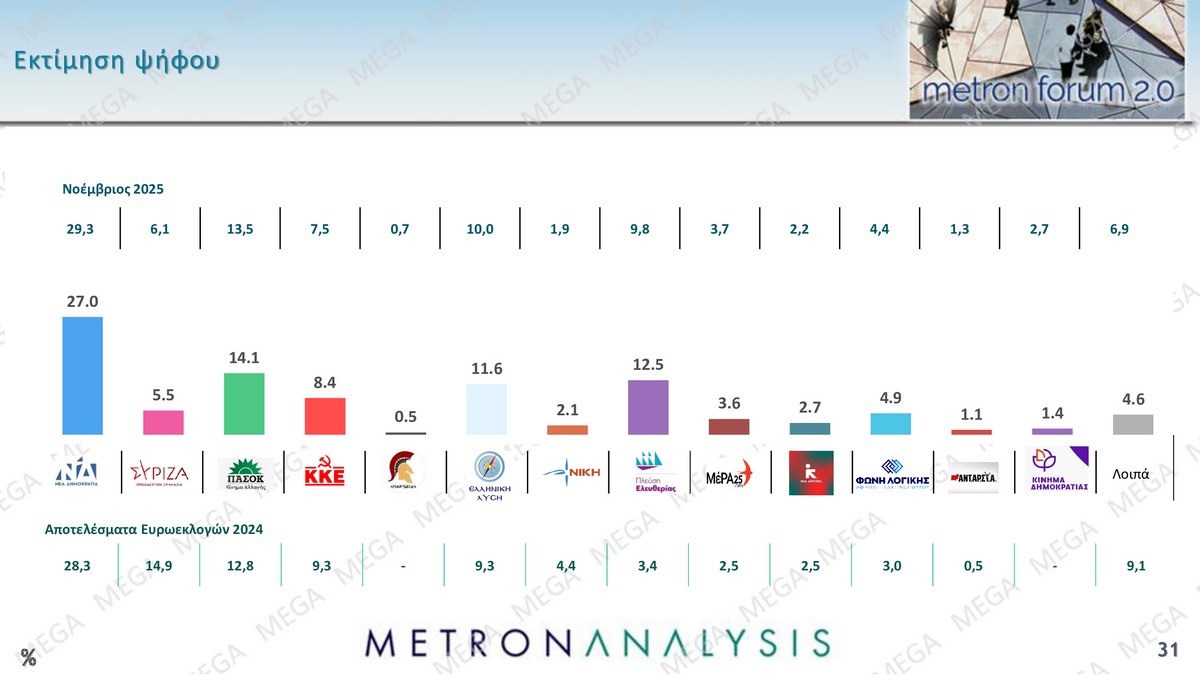 Στην εκτίμηση ψήφου η ΝΔ είναι πρώτη με 27% και ακολουθεί το ΠαΣοΚ με 14,1%. Τρίτη είναι η Πλεύση Ελευθερίας με 12,5% και τέταρτη η Ελληνική Λύση με 11,6%. Εντός Βουλής βρίσκονται ακόμα το ΚΚΕ, ο ΣΥΡΙΖΑ, η Φωνή Λογικής και το ΜεΡΑ 25.