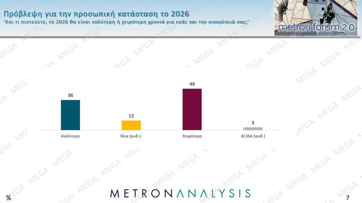 Την ίδια ώρα οι πολίτες δεν κρύβουν την απαισιοδοξία τους για το μέλλον. Σχεδόν 1 στους 2 πιστεύει ότι η προσωπική του κατάσταση θα είναι χειρότερη το 2026 από ότι φέτος. Αντίθετα, το 36% είναι αισιόδοξος για την πορεία του.