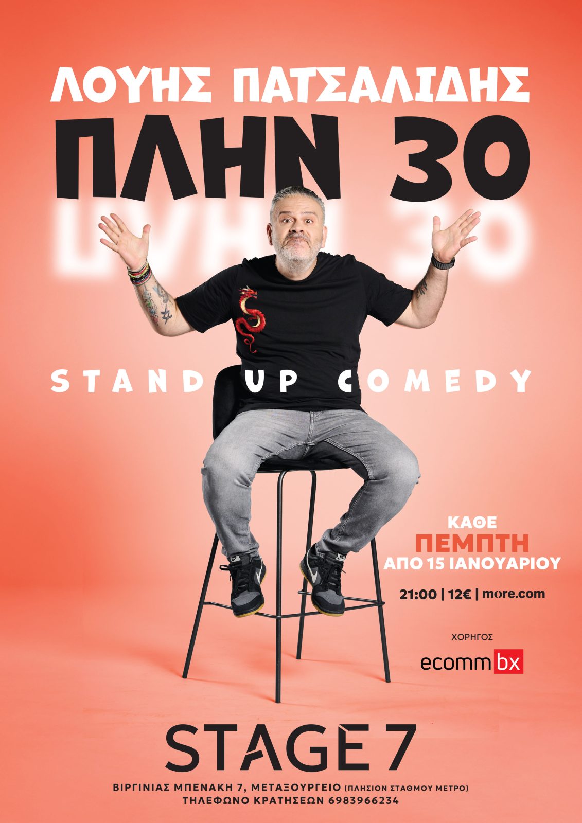 Ο Κύπριος κωμικός Λούης Πατσαλίδης, παρουσιαστής του δημοφιλέστερου σατιρικού show στην κυπριακή τηλεόραση «Λούης Night Show», φέρνει το εκρηκτικό του χιούμορ στο νέο πολιτιστικό στέκι της Αθήνας «Stage 7» με την παράσταση του «Πλην 30».