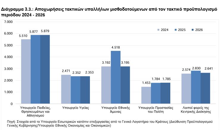Σε ότι αφορά τις προσλήψεις τακτικού προσωπικού, κατά την τριετία 2024-2026 έγιναν 46.228, ενώ αναμένονται άλλες 10.000 μέχρι το τέλος του έτους – σύμφωνα πάντα με την Εισηγητική Έκθεση – στο χώρο της Εκπαίδευσης.
