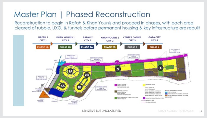 Η ανοικοδόμηση θα προχωρήσει σε τέσσερις φάσεις, ξεκινώντας από το νότο με τη Ράφα και το Χαν Γιούνις, προτού προχωρήσει βόρεια προς τα «κεντρικά στρατόπεδα» και, τέλος, την πρωτεύουσα Γάζα.