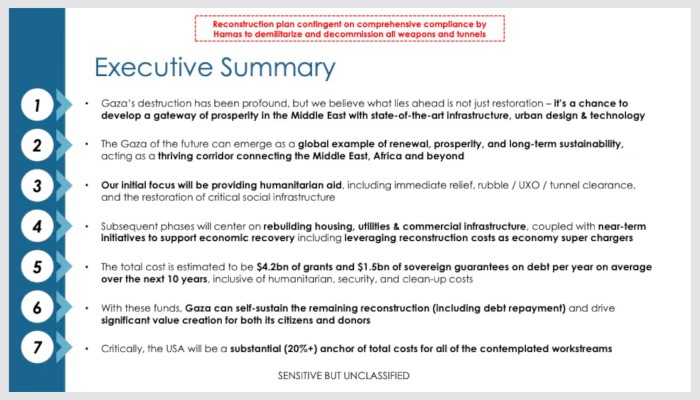Η παρουσίαση φέρει την ένδειξη «ευαίσθητη αλλά μη ταξινομημένη» και δεν αναλύει λεπτομερώς ποιες χώρες ή εταιρείες θα χρηματοδοτήσουν την ανοικοδόμηση της Γάζας. Ούτε προσδιορίζει πού ακριβώς θα ζήσουν τα 2 εκατομμύρια εκτοπισμένων Παλαιστινίων κατά τη διάρκεια της ανοικοδόμησης. Οι ΗΠΑ έχουν δείξει τις διαφάνειες σε υποψήφιες χώρες δωρητές, σύμφωνα με Αμερικανούς αξιωματούχους, συμπεριλαμβανομένων των πλούσιων βασιλείων του Κόλπου, της Τουρκίας και της Αιγύπτου.