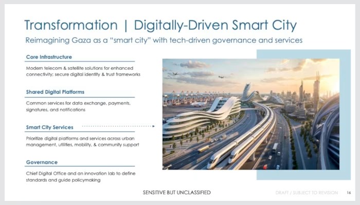 Μια ομάδα με επικεφαλής τον γαμπρό του Προέδρου Τραμπ, Τζάρετ Κούσνερ, και τον απεσταλμένο για τη Μέση Ανατολή, Στιβ Γουίτκοφ, δύο κορυφαίους βοηθούς του Λευκού Οίκου, ανέπτυξε ένα προσχέδιο πρότασης για τη μετατροπή της βομβαρδισμένης ενκλάβης σε μια λαμπερή μητρόπολη. Σε 32 σελίδες διαφανειών PowerPoint, γεμάτες με εικόνες από παράκτια ουρανοξύστες, μαζί με διαγράμματα και πίνακες κόστους, το σχέδιο περιγράφει τα βήματα που πρέπει να γίνουν για να μεταφερθούν οι κάτοικοι της Γάζας από σκηνές σε ρετιρέ και από τη φτώχεια στην ευημερία.