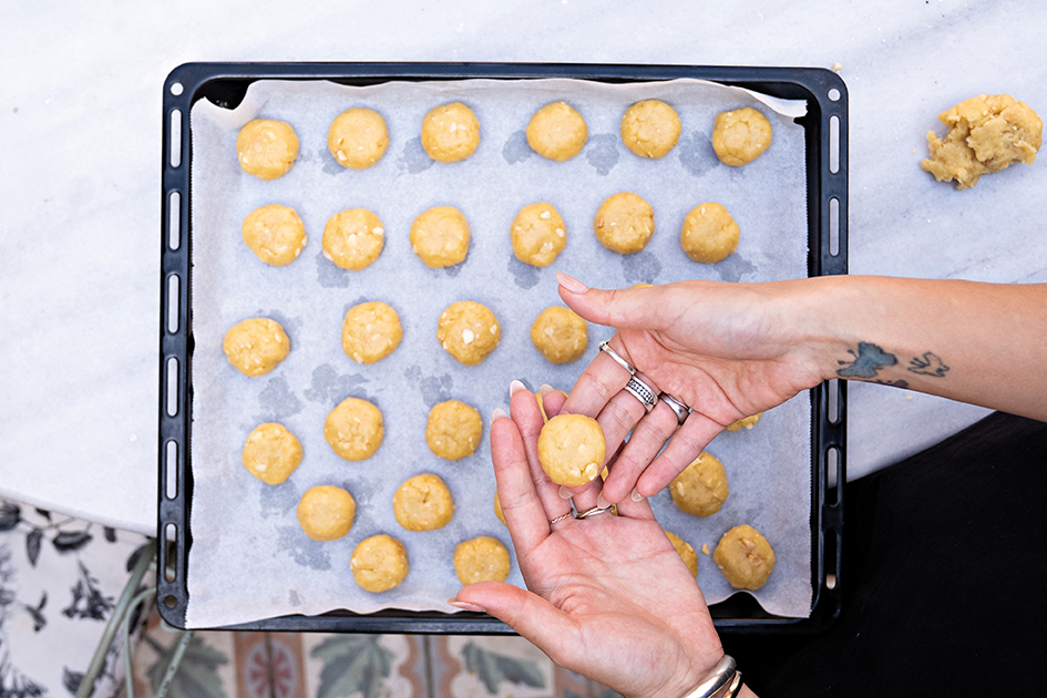- Ζυμώνουμε για 2 λεπτά και στη συνέχεια είτε πλάθουμε μπαλάκια από το μείγμα τα οποία πατάμε ελαφρώς είτε το ανοίγουμε σε χοντρό φύλλο και κόβουμε σχήματα με κουπ πατ.