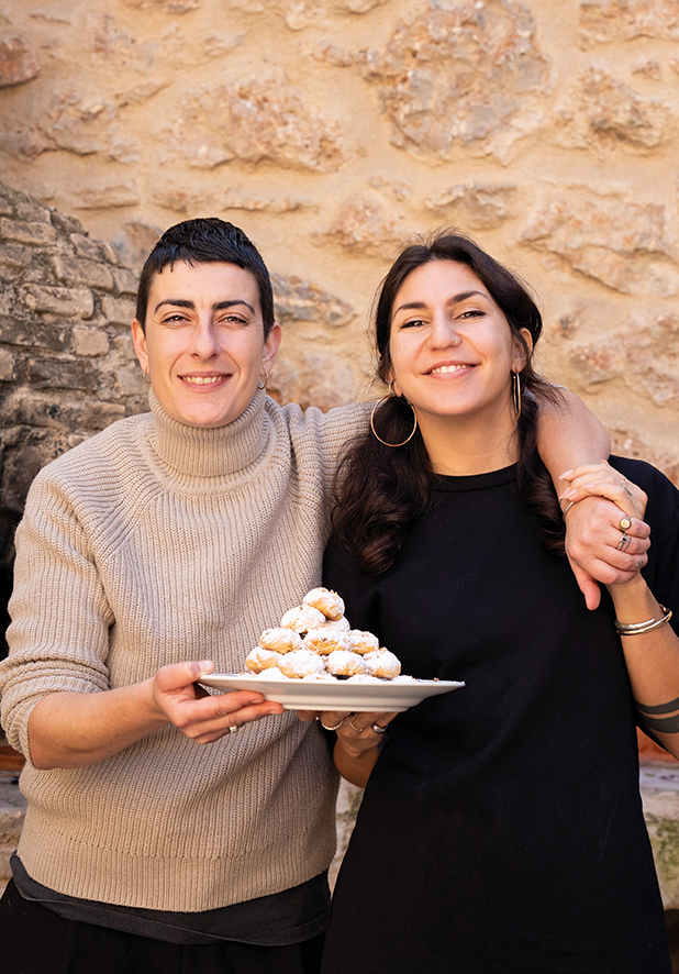 Η Βιβή Λαμπροπούλου και η Αγάπη Μιχελή μάς κερνάνε καλογερικούς κουραμπιέδες με ελαιόλαδο και κρασί. Φωτό: Χρήστος Καββούρης