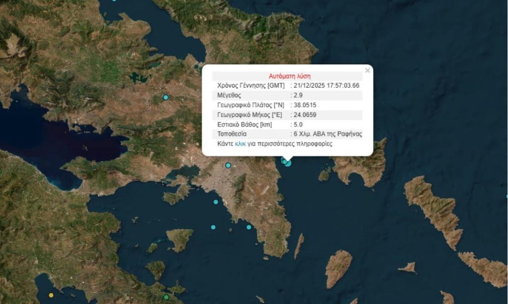 Διπλή σεισμική δόνηση 2,9 βαθμών και 2,7 της κλίμακας Ρίχτερ σημειώθηκε το βράδυ της Κυριακής, στις 19:50 και στις 19:57 αντίστοιχα, 6 χιλιόμετρα ανατολικά, βορειανατολικά της Ραφήνας.
