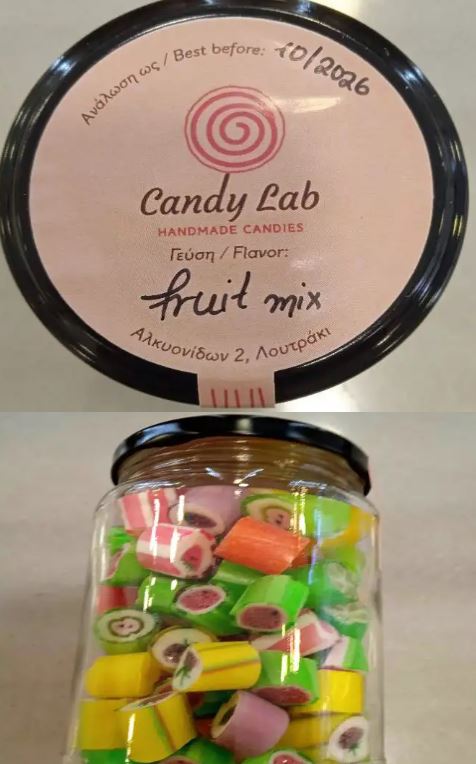 - Καραμέλες «fruit mix» με ημερομηνία ανάλωσης ως 10/2026, συσκευασίας καθαρού βάρους περίπου 230 γρ., το οποίο παράγεται και συσκευάζεται στην Ελλάδα από την «Candy Lab» που εδρεύει στο Λουτράκι Κορινθίας.