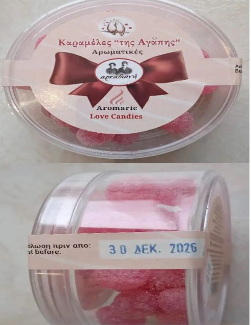 - Καραμέλες «της Αγάπης-Αρωματικές» με ημερομηνία ανάλωσης πριν από τις 30 Δεκ. 2026, συσκευασίας καθαρού βάρους περίπου 110 γρ. της εταιρείας με διακριτικό τίτλο «αρκαδιανή» που εδρεύει στο Ψάρι Αρκαδίας.