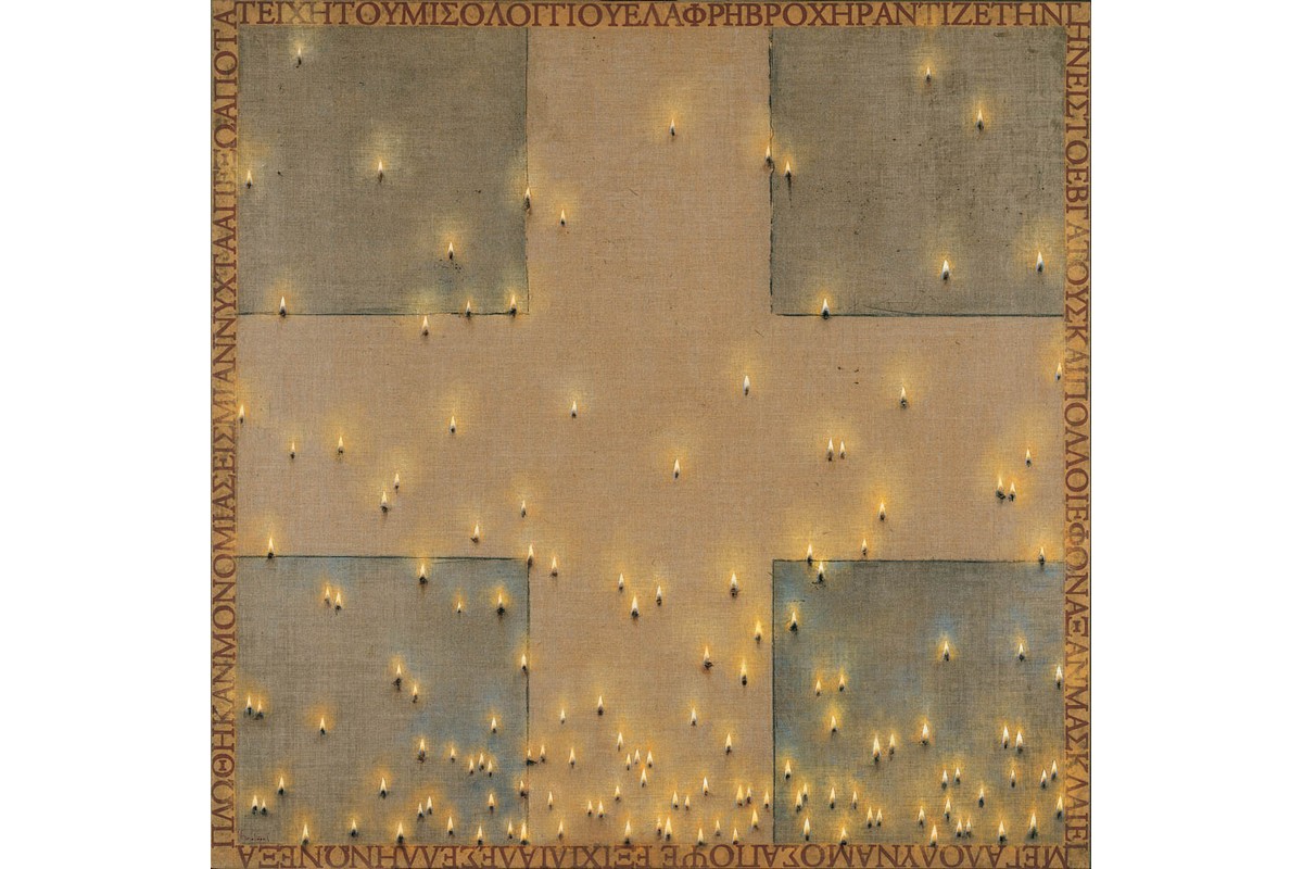 Η Σακελαροπούλου ύφανε μια ελληνική σημαία απ’ άκρη σ’ άκρη, αντίστοιχη με το συμβολικό δώρο του συλλέκτη Σωτήρη Φέλιου προς την Προεδρία: μια πελώρια σημαία του Χρήστου Μποκόρου που μεταβάλει το “Ut pictura, poesis” του Ορατίου σε “Ut pictura, politica”.