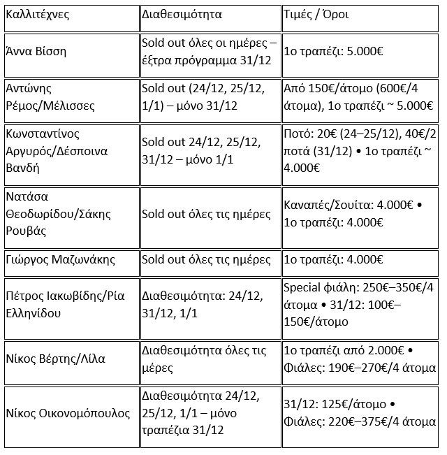 Διαθεσιμότητα για την παραμονή της Πρωτοχρονιά έχουν η Άννα Βίσση, ο Αντώνης Ρέμος με τις Μέλισσες, ο Νίκος Οικονομόπουλος, ενώ ο Κωνσταντίνος Αργυρός με τη Δέσποινα Βανδή έχουν διαθέσιμα τραπέζια την Πρωτοχρονιά.