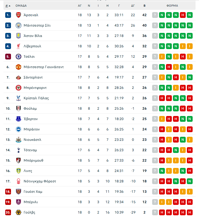 Μετά την ήττα στο Έμιρεϊτς, η Μπράιτον έμεινε στους 24 βαθμούς και στην 12η θέση της βαθμολογίας.