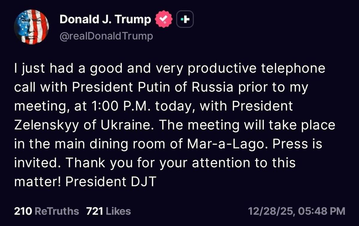 Σύμφωνα με όσα έγραψε στο Truth Social ο Τραμπ: «Μόλις είχα ένα καλό και πολύ παραγωγικό τηλεφώνημα με τον Πρόεδρο Πούτιν της Ρωσίας πριν από την συνάντηση μου στη 1:00μμ σήμερα, με τον Πρόεδρο Ζελένσκι της Ουκρανίας. Η συνάντηση θα πραγματοποιηθεί στην κύρια τραπεζαρία του Μαρ-α-λάγκο. Ο Τύπος έχει προσκληθεί. Σας ευχαριστώ για την προσοχή σας σε αυτό το θέμα». Την συνομιλία επιβεβαίωσε και το Κρεμλίνο.