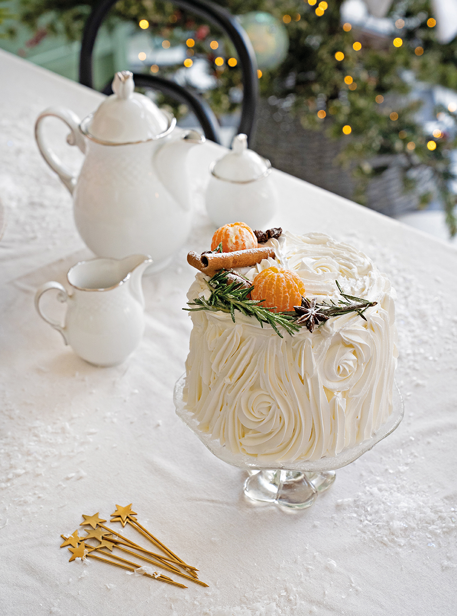 - Τοποθετούμε το πρώτο κέικ σε μια βάση. Απλώνουμε από πάνω μια λεπτή στρώση μαρμελάδας μανταρίνι και καλύπτουμε ομοιόμορφα με σαντιγί. Σκεπάζουμε με το επόμενο κέικ και επαναλαμβάνουμε τη διαδικασία μέχρι να τελειώσουν τα υλικά. Τέλος, επικαλύπτουμε ομοιόμορφα όλη την επιφάνεια του γλυκού με σαντιγί και κάνουμε χριστουγεννιάτικα σχέδια διακοσμώντας με μανταρίνια, ξυλάκια κανέλας και δεντρολίβανο.