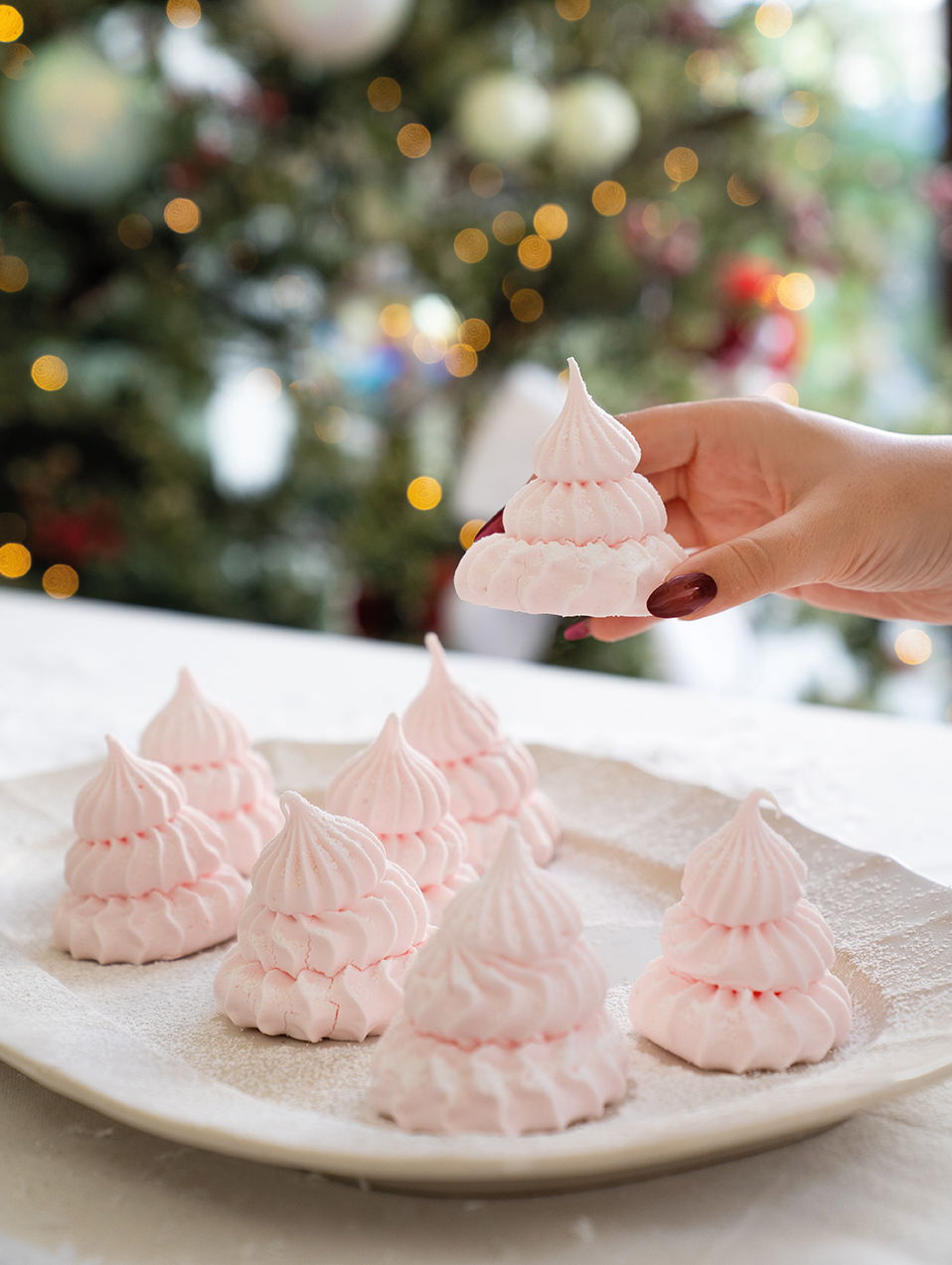 - Μεταφέρουμε τη μαρέγκα σε σακούλα ζαχαροπλαστικής με μύτη σε σχήμα αστεριού. Σχηματίζουμε μικρά χριστουγεννιάτικα δέντρα μαρέγκας σε ταψί στρωμένο με αντικολλητικό χαρτί, πιέζοντας τρεις φορές. Ψήνουμε σε προθερμασμένο φούρνο, στους 110°C, για μία ώρα.