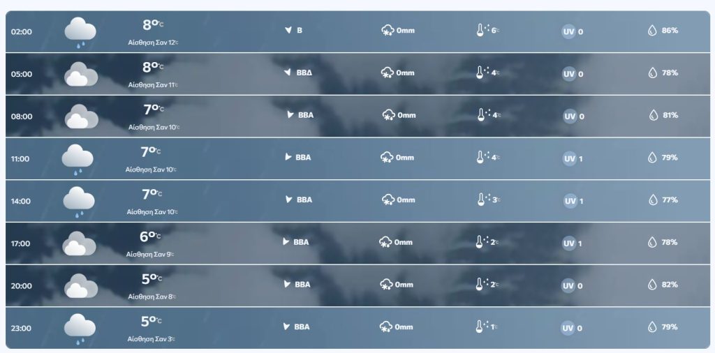 Θερμοκρασία: Από 03 έως 15 βαθμούς Κελσίου. Στα βόρεια 2 με 3 βαθμούς χαμηλότερη.