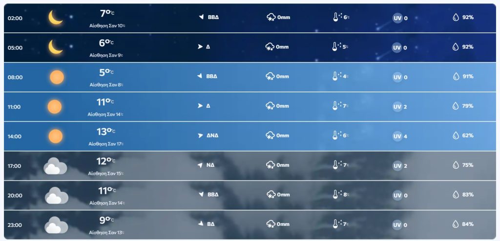 Θερμοκρασία: Από -01(μείον 01) έως 11 βαθμούς Κελσίου. Στη δυτική Μακεδονία και τη Θράκη η ελάχιστη 3 με 4 βαθμούς χαμηλότερη.
