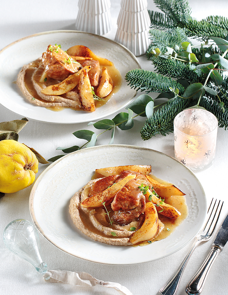 Χοιρινό με κυδώνια σε Vinsanto Σαντορίνης και κρέμα κάστανου με καρύδια