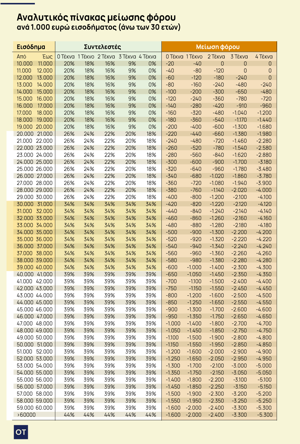 Σε άλλο παράδειγμα, κάποιος που έχει ετήσιο εισόδημα 10.000-11.000 ευρώ και 2 παιδιά, η ελάφρυνσή του θα είναι 0 (μηδέν), όπως και αν έχει 3 ή 4 παιδιά! Μήπως δεν υπάρχει ανάγκη για ελαφρύνσεις σε όσους βρίσκονται σε αυτήν την κλίμακα και έχουν 2 παιδιά; Την ίδια στιγμή, κάποιος που βρίσκεται στην κλίμακα 50.000-51.000 ευρώ και 2 παιδιά θα διαπιστώσει μια ελάφρυνση της τάξης των 1.950 ευρώ. Εάν έχει 3, η μείωση φόρου φτάνει τα 2.850 ευρώ και εάν έχει 4, τότε ελαφρύνεται κατά 4.850 ευρώ!
