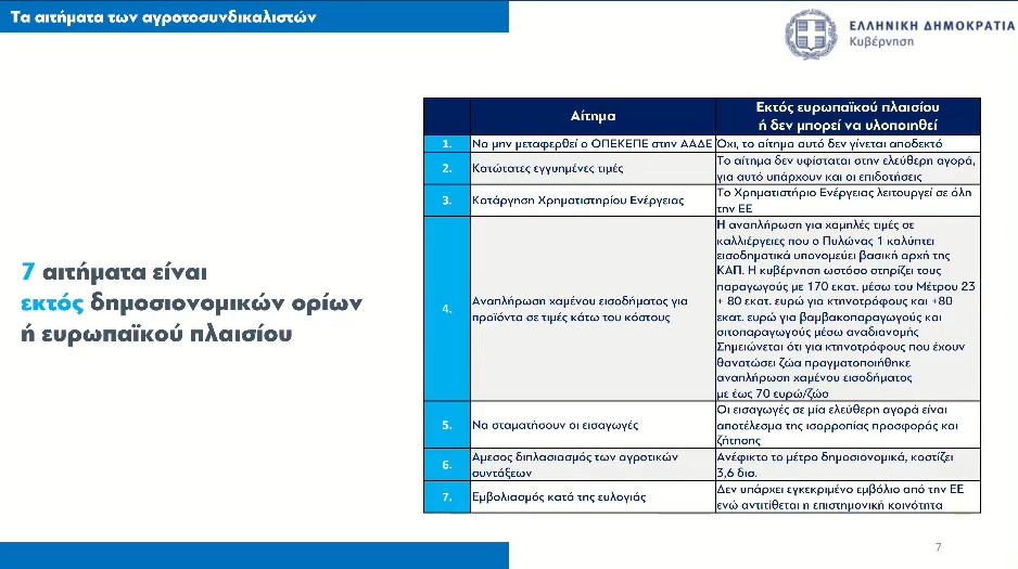 Σε άλλο σημείο της συνέντευξης Τύπου ο αντιπρόεδρος της κυβέρνησης τόνισε ότι από τα 27 αιτήματα των αγροτών έχουν ικανοποιηθεί τα 16, ενώ τέσσερα βρίσκονται υπό επεξεργασία, και σημείωσε πως 7 από τα αιτήματα των αγροτών είναι εκτός δημοσιονομικού ορίου και πλαισίου της ΕΕ.
