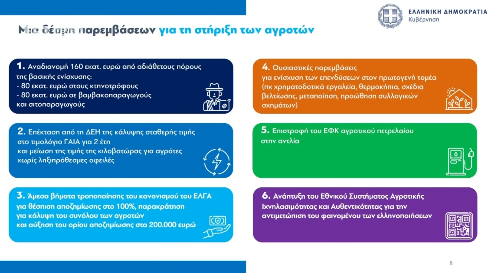 Μεταξύ άλλων παρουσιάστηκαν οι έξι παρεμβάσεις της Κυβέρνησης για τον πρωτογενή τομέα. Αυτές αφορούν την αναδιανομή 160 εκατ ευρώ από αδιάθετους πόρους, την τροποποίηση του κανονισμού του ΕΛΓΑ για τις αποζημιώσεις και την επιστροφή του ΕΦΚ αγροτικού πετρελαίου στην αντλία.
