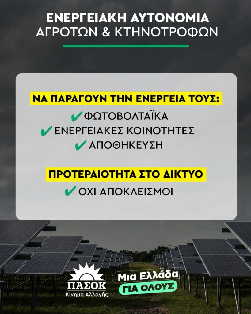 «Η ενεργειακή αυτάρκεια του πρωτογενούς τομέα αποτελεί προϋπόθεση για τη βιωσιμότητα της αγροτικής παραγωγής, τη μείωση του κόστους και την ενίσχυση του αγροτικού εισοδήματος», τονίζει το ΠαΣοΚ, καταθέτοντας, όπως αναφέρει, «κοστολογημένη και εφαρμόσιμη πρόταση»: