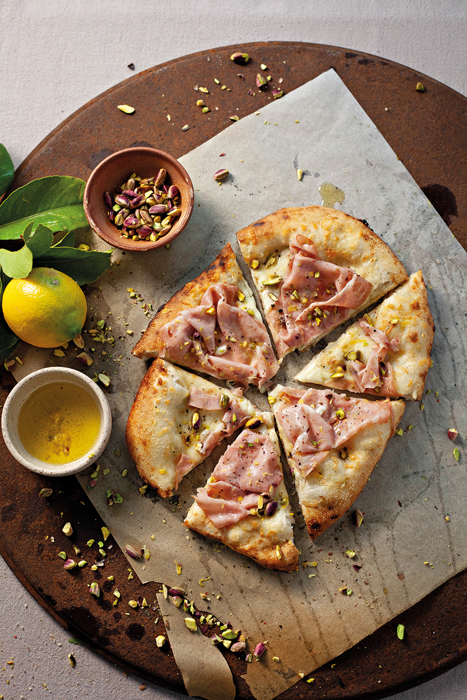Λευκή πίτσα με μορταδέλα και φιστίκι