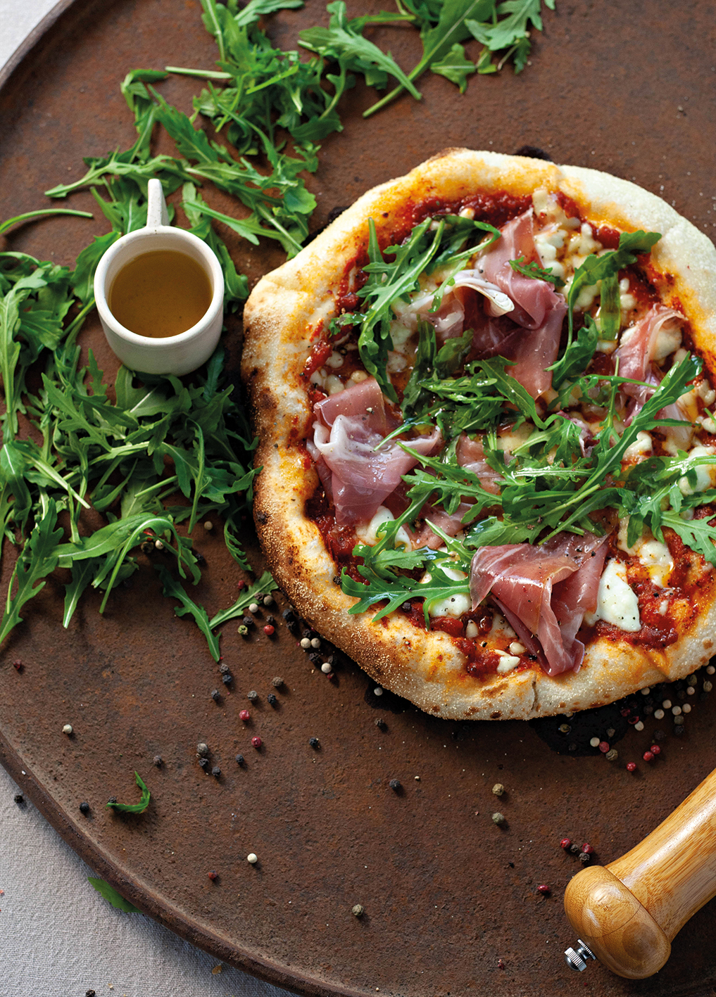 Πίτσα με μοτσαρέλα, προσούτο, σάλτσα ντομάτας και ρόκα