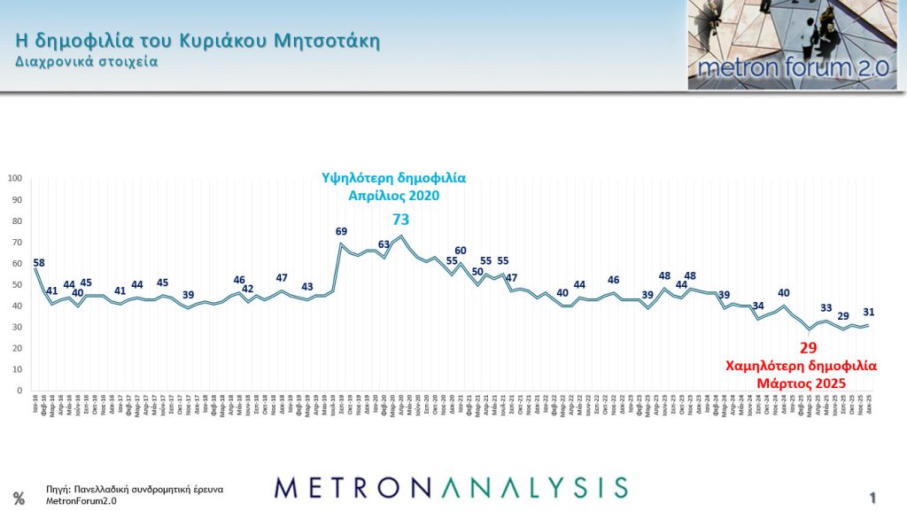 Αυτές είναι ορισμένες από τις καμπές που θα μπορούσαν να ερμηνεύουν τη σταδιακή φθορά του Κ. Μητσοτάκη (και της κυβέρνησης), με αποτέλεσμα η δημοφιλία του καθ’ όλη τη διάρκεια του 2025 να κινείται κάτω από το 40% – για να φτάσει στο χαμηλότερο επίπεδο της δεκαετίας αυτής, στο 29%, τον Μάρτιο 2025 μετά τις μεγάλες διαδηλώσεις για τα Τέμπη.