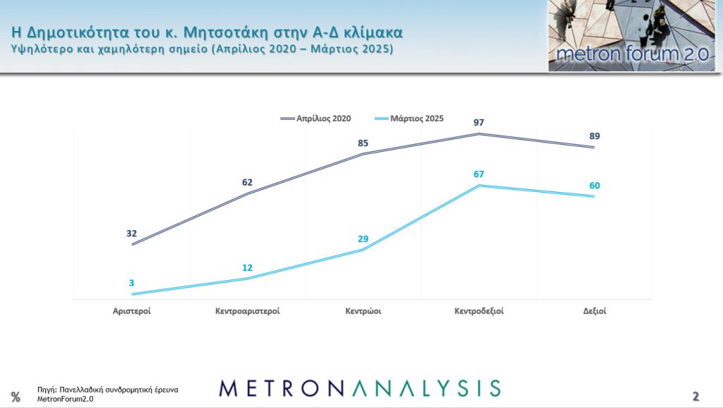 Εκτός από τη συγκυρία, όμως, μοιάζει να έχει αλλάξει και το προφίλ της δημοφιλίας του Κ. Μητσοτάκη, επομένως και η βάση υποστήριξής του. Τον Μάρτιο του 2025 διατηρεί την αιχμή των θετικών αξιολογήσεων τους Κεντροδεξιούς, αλλά με σημαντική πτώση από το 97% του Απριλίου 2020 σε 67%, εμφανίζοντας μια περίπου ισοδύναμη κάμψη στους Δεξιούς (από 89% σε 60%). Η μείωση της δημοφιλίας είναι ωστόσο ραγδαία στους Κεντρώους: από 85% την περίοδο της πανδημίας σε 29%, με ισχνά ποσοστά σε Αριστερούς-Κεντροαριστερούς.
