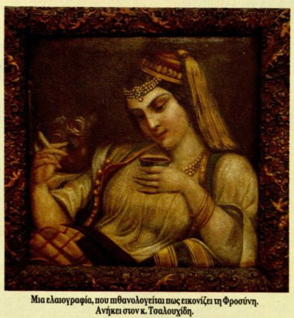 »Είναι αλήθεια εξακριβωμένη πως στο σπίτι της Φροσύνης συνάζονται διάφοροι Έλληνες και Τούρκοι, πως αρκετοί απ’ αυτούς ήταν εραστές της και πως μέσα στον οντά της γίνονταν διάφορες συναντήσεις και συζητήσεις. Αυτά τα στοιχεία είναι που κάνουν τον ξένο περιηγητή να την παρομοιάσει με τις αρχαίες εταίρες και απ’ αυτή την άποψη η Φροσύνη ήταν μια επιβίωση της Ασπασίας και της Φρύνης στα Γιάννενα του 18ου αιώνα».
