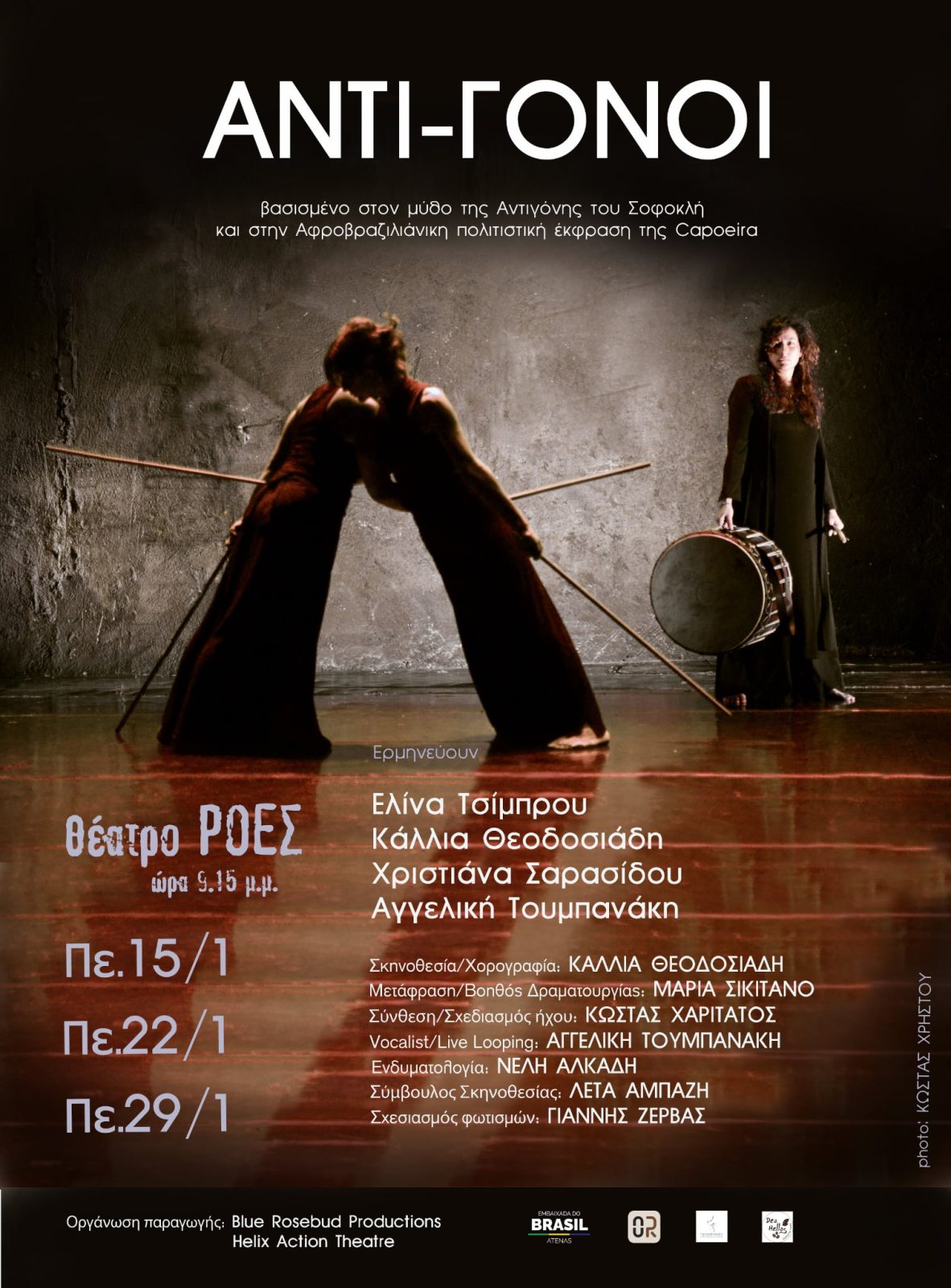 Οι «Αντί-γονοι» είναι αποτέλεσμα ερευνητικής, εργαστηριακής διαδικασίας με ακαδημαϊκό υπόβαθρο και τη συνεργασία καλλιτεχνών από διαφορετικά πεδία (μουσική, χορός, θέατρο και Capoeira), δημιουργώντας ένα ολιστικό, τελετουργικό και διαπολιτισμικό θέατρο.