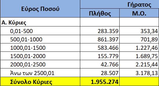 Έξι στους δέκα συνταξιούχους λαμβάνουν κύρια σύνταξη κάτω των 1.000 ευρώ ενώ το 41,45% ξεπερνά το ποσό αυτό. Συγκεκριμένα 283.359 συνταξιούχοι λαμβάνουν σύνταξη έως 500 ευρώ και 861.397 έχουν σύνταξη από 500 έως 1.000 ευρώ. Επίσης 810.518 συνταξιούχοι λαμβάνουν σύνταξη άνω των 1.000 μηνιαίως.