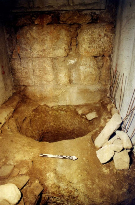 Το ανάλημμα της αρχαίας οδού Τριπόδων στον αύλειο χώρο. Διακρίνονται υστερορωμαϊκοί-παλαιοχριστιανικοί αγωγοί
