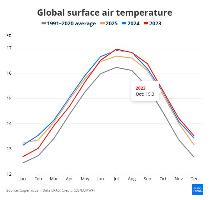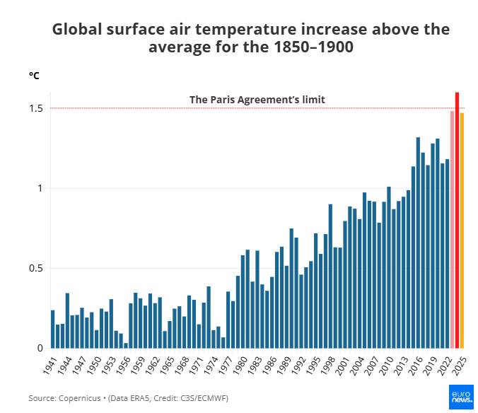 Το 2025, η θερμοκρασία του αέρα στην επιφάνεια της Γης και των ωκεανών ήταν ανώτερη κατά 1,47° Κελσίου από το προβιομηχανικό επίπεδο, ενώ ήταν 1,60° Κελσίου υψηλότερη το 2024, τη χρονιά-ρεκόρ.