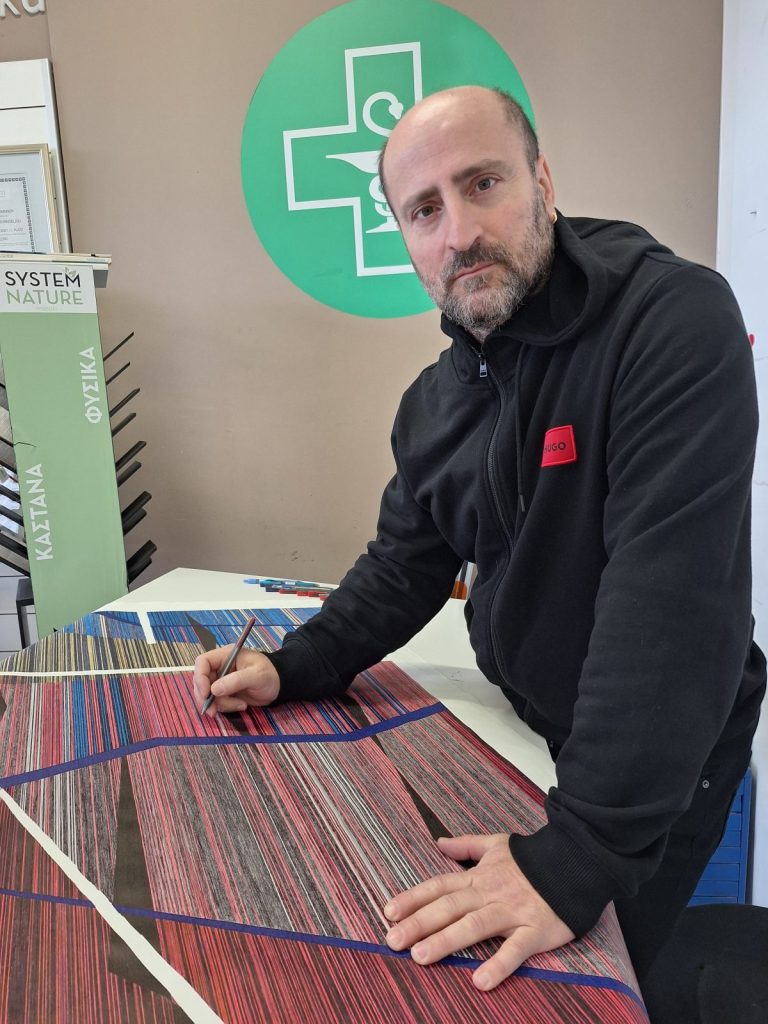 Και η επιμελήτρια της έκθεσης, Ελισάβετ Πλέσσα, επισημαίνει στο κείμενό της σχετικά με την τεχνική του καλλιτέχνη και το ιδιότυπο ατελιέ του που στεγάζεται στο φαρμακείο του: «Η επιλογή των μέσων του –κατά κύριο λόγο στιλό διαρκείας, αλλά και δεκάδες πένες, πενάκια, μαρκαδόροι, μολύβια και ακρυλικά, πάνω σε χαρτί ή σε καμβά– δεν είναι αυθαίρετη: προκύπτει από μια δεδομένη συνθήκη, η οποία από πρακτική αναγκαιότητα μετατρέπεται σε δημιουργική διαδικασία με συγκεκριμένα υποστρώματα και χρωστικά υλικά, και που αντί να τον δεσμεύσει του προσφέρει ένα πλαίσιο ελευθερίας μέσα στο οποίο η ζωγραφική του βρίσκει αβίαστα τους τρόπους της».