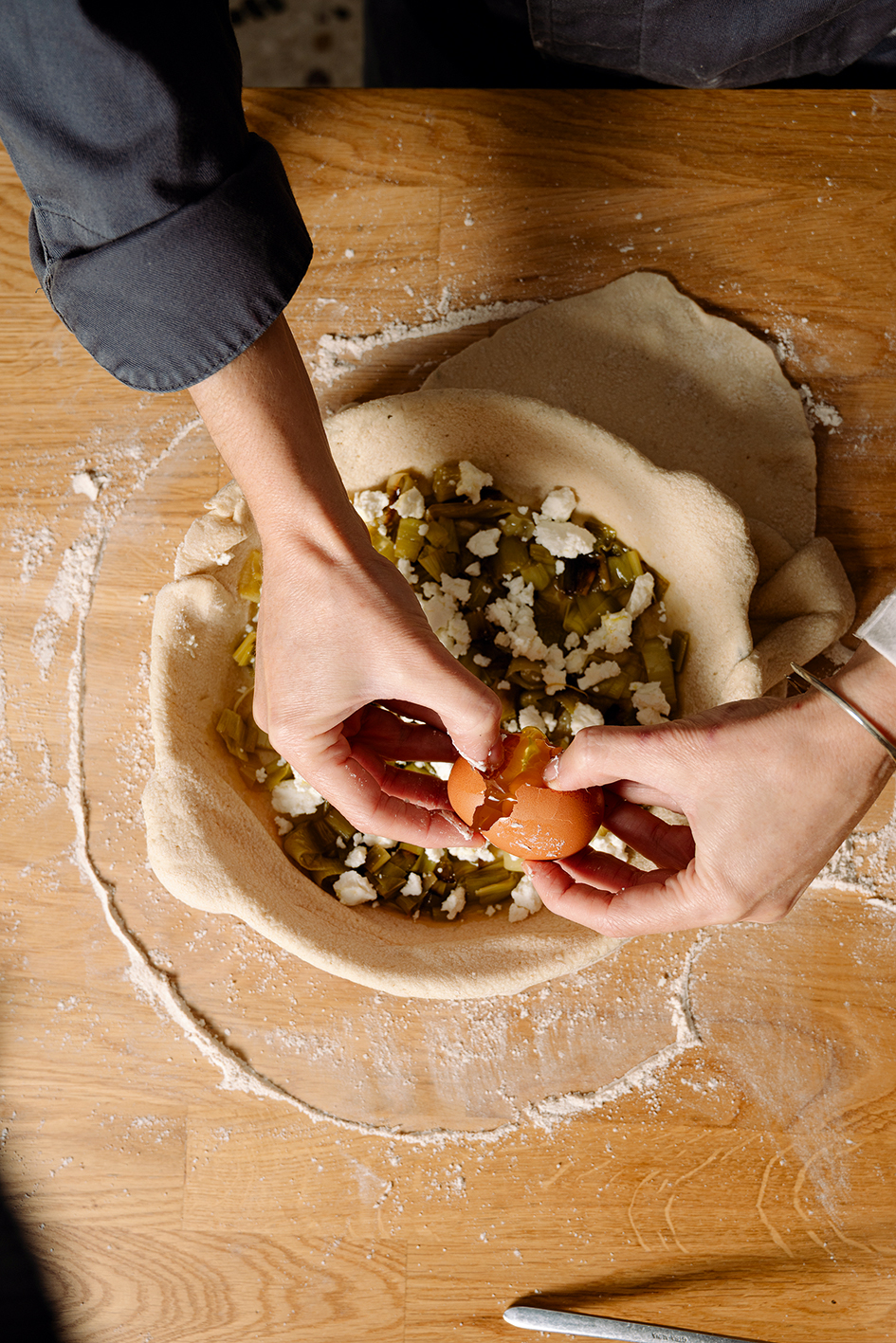- Σε έναν καθαρό πάγκο πασπαλίζουμε μια χούφτα αλεύρι και με ένα πλάστη ανοίγουμε το ζυμάρι σε φύλλο με διάμετρο τουλάχιστον 6-7 εκατοστά μεγαλύτερη από αυτήν του πυρίμαχου σκεύος ή του ταψιού που θα χρησιμοποιήσουμε ώστε να διπλωθεί μετά από πάνω και να σκεπάσει τη γέμιση της πίτας. Τυλίγουμε γύρω από τον πλάστη το ζυμάρι και το ξεδιπλώνουμε προσεκτικά να καλύψει την επιφάνεια του σκεύους.