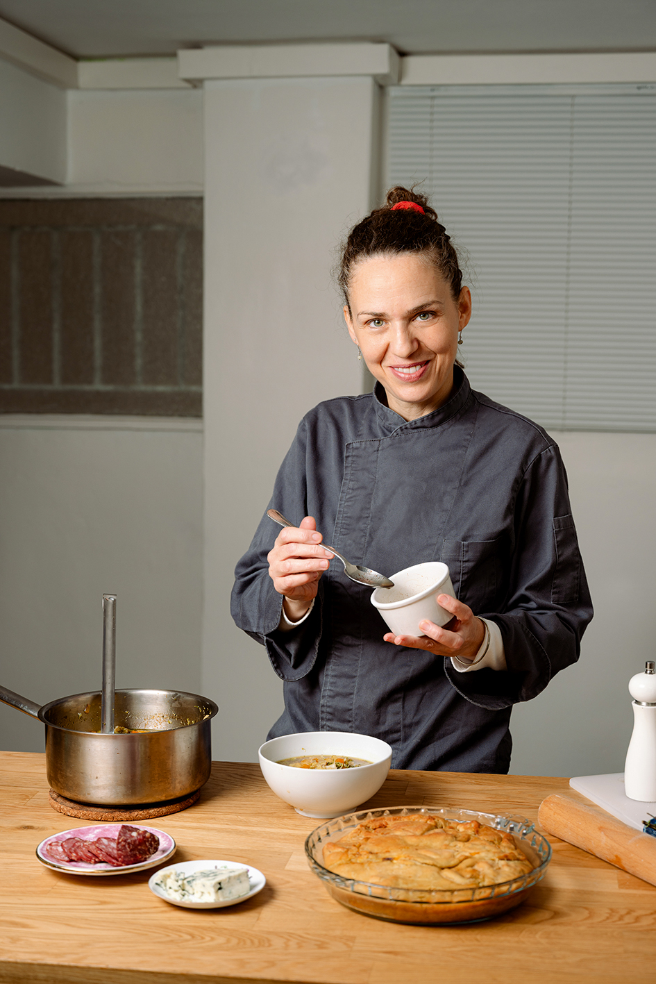 Η Χρύσα Γερακοπούλου μάς υποδέχθηκε στο λιτής αισθητικής, αλλά εξαιρετικά ζεστό και φιλόξενο μαγειρείο της, στα Ιλίσια. Φωτό: Γιώργος Καπράνος