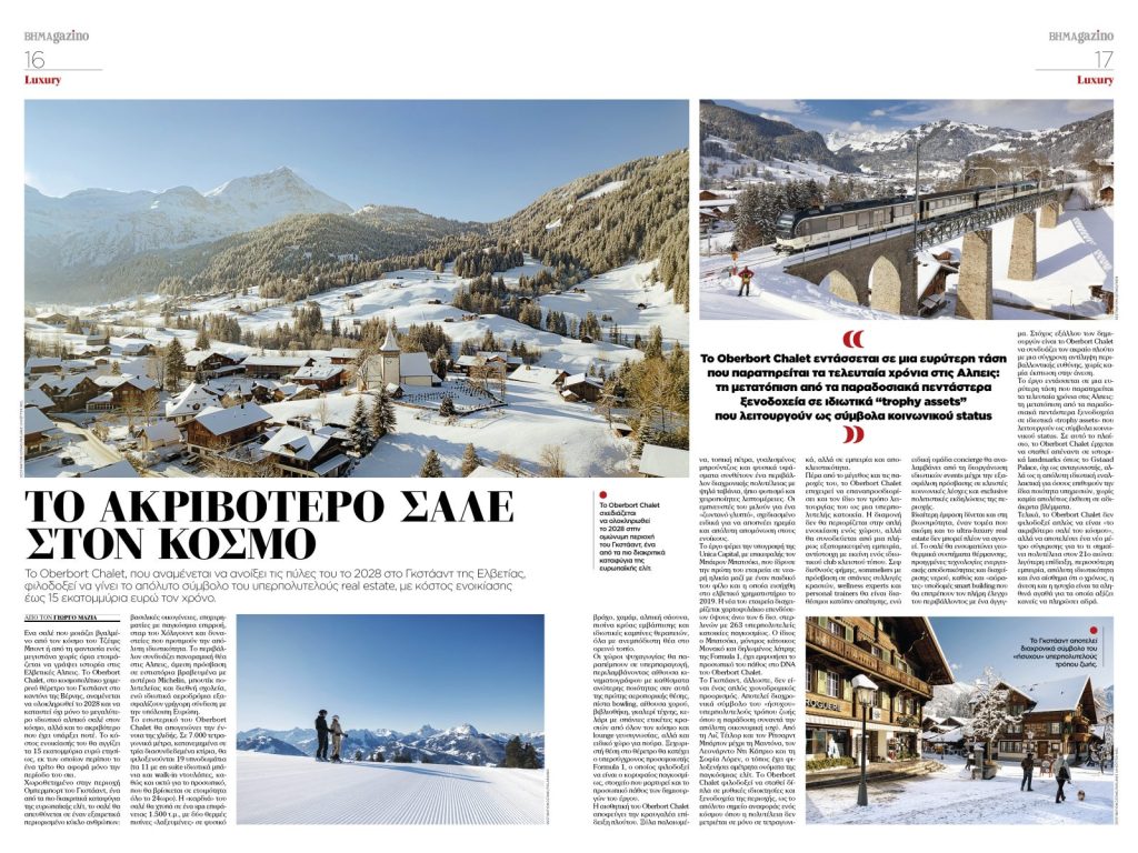 Στο πεδίο της υπερπολυτέλειας, το ακριβότερο σαλέ στον κόσμο ετοιμάζεται να ανοίξει τις πύλες του το 2028 στο Γκστάαντ της Ελβετίας. Το Obertbort Chalet φιλοδοξεί να αποτελέσει το απόλυτο σύμβολο του luxury real estate, με κόστος ενοικίασης που αγγίζει τα 15 εκατομμύρια ευρώ ετησίως.