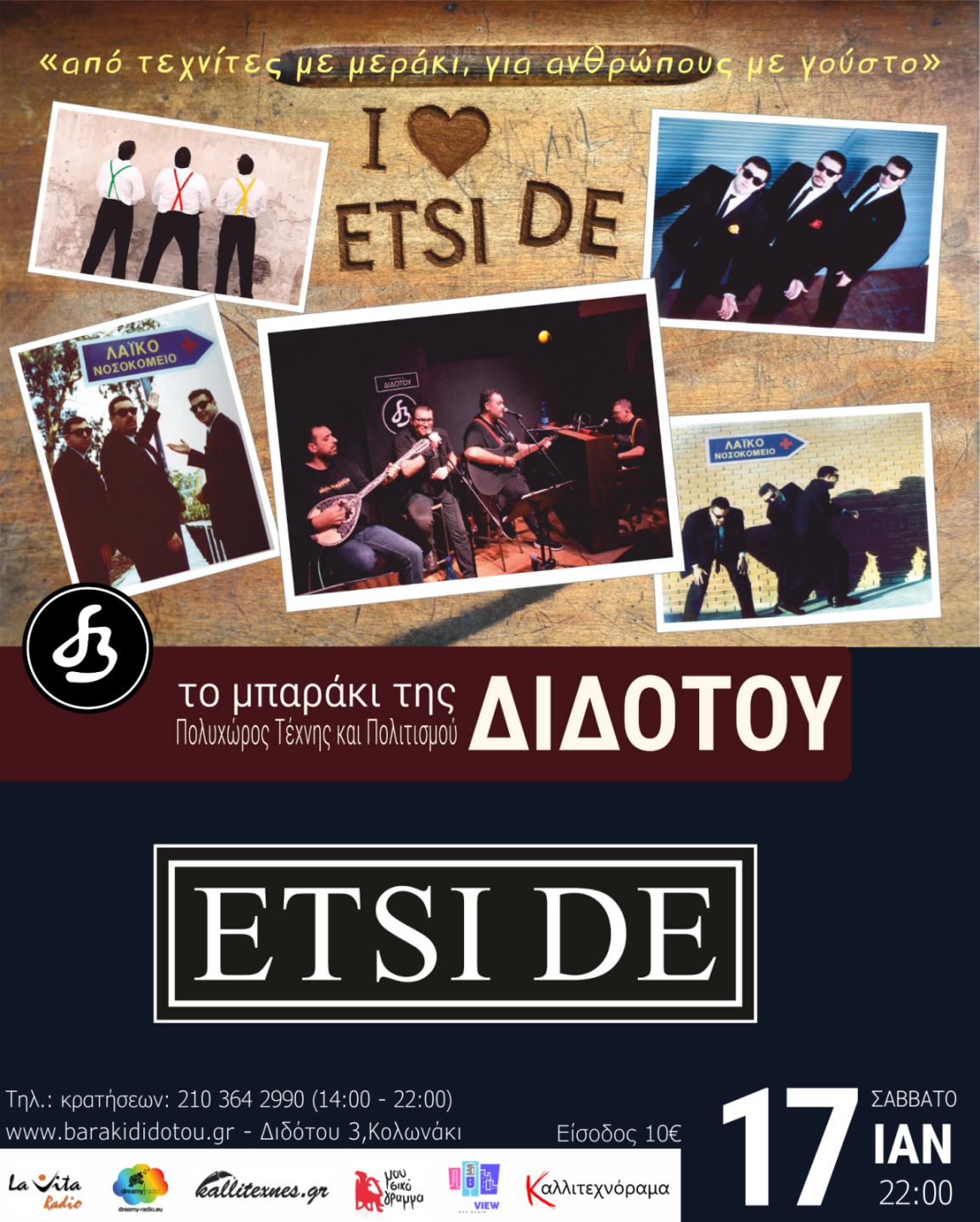 Το σατυρικό μουσικό σχήμα ETSI DE δημιουργήθηκε στα τέλη του προηγούμενου αιώνα (!) από τους Δημήτρη Μουτζουράκη, Μιχάλη Χατζηαρσενίου και Γιάννη Γιαννακάκη. Πρωτοεμφανίστηκε στη δισκογραφία το Δεκέμβριο του 2001 με το CD Single “Στροφή στο Λαϊκό” (LYRA) το οποίο έγινε σύντομα Χρυσό! Ακολούθησαν οι δίσκοι “Εύκολο” και “Ya mas”.