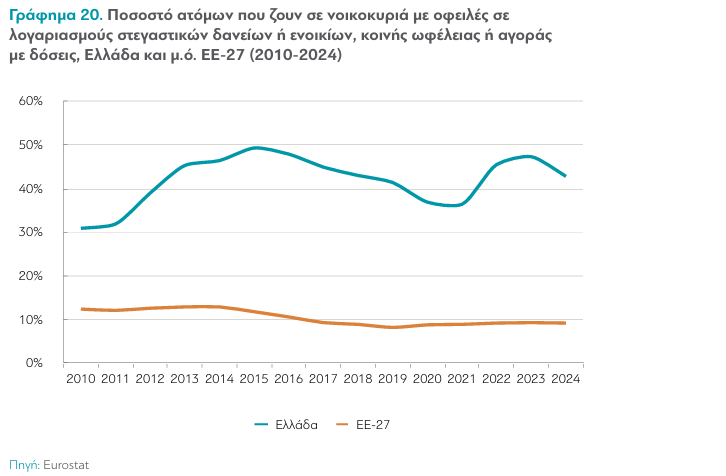 Σύμφωνα με τα στοιχεία της Eurostat που αξιοποιεί η μελέτη, το κόστος στέγασης στην Ελλάδα παραμένει διαχρονικά υψηλότερο από τον μέσο όρο της Ευρωπαϊκής Ένωσης. Το κόστος αυτό περιλαμβάνει ενοίκια, δόσεις στεγαστικών δανείων, φόρους ακίνητης περιουσίας, καθώς και δαπάνες για ενέργεια και λοιπούς λογαριασμούς.