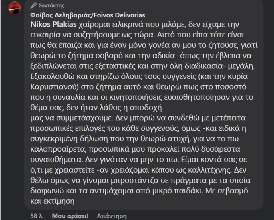 Κατά των δηλώσεων Καρυστιανού τοποθετήθηκε με ανάρτησή του και ο τραγουδοποιός Φοίβος Δεληβοριάς για να εισπάξει την αντίδραση του Νίκου Πλακιά, παρά το γεγονός ότι δεν τάχθηκε υπέρ της κυρίας Καρυστιανού: